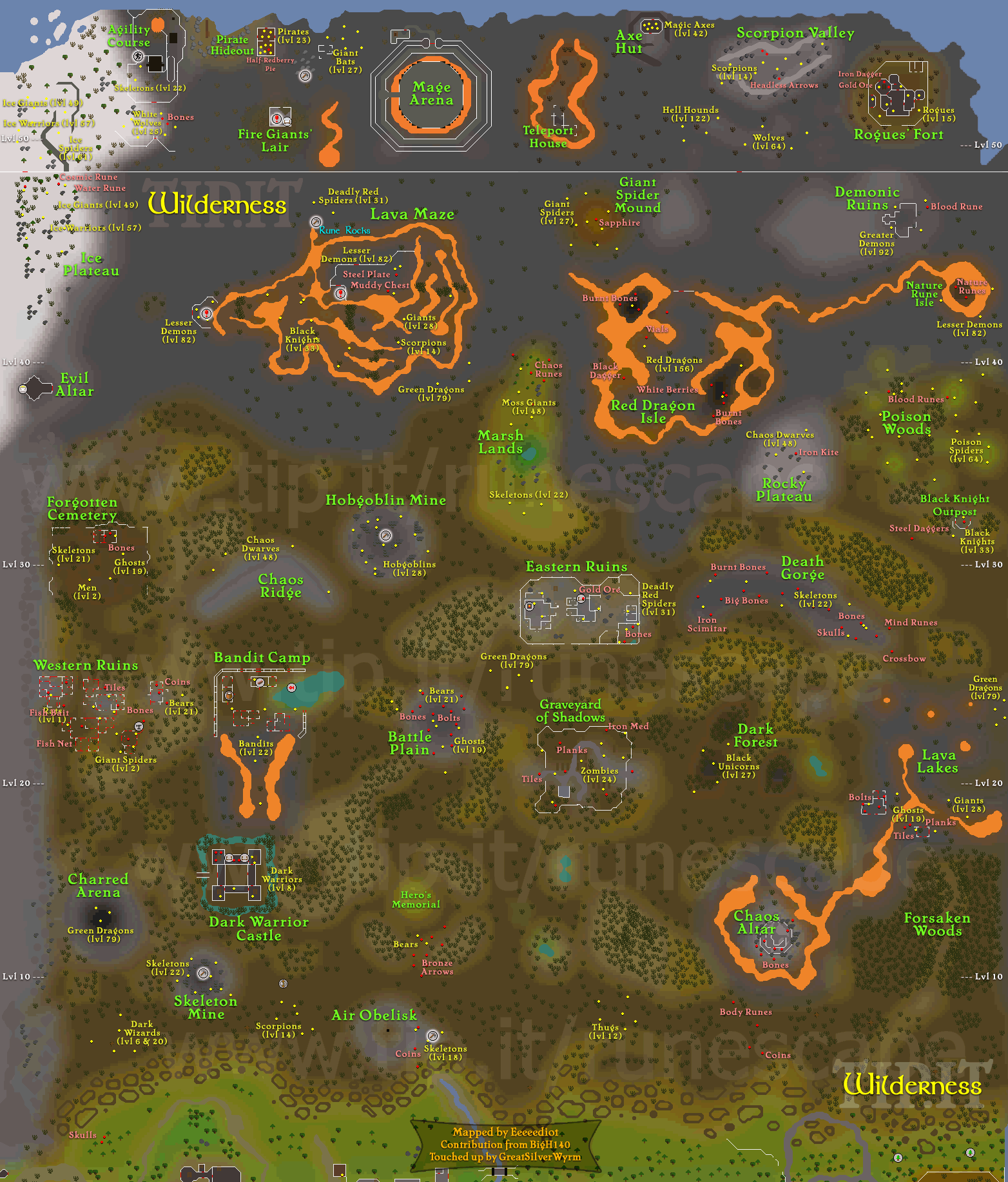 nincsenek sárkányok a wildybe f2p-n :/ Izé van wildybe ami még kihívás lehet: Greater Demon, de nagyon bent van:/ Tegnap egy 95-ös mage majnem megpurcantott haveromat megengem chaos dwarfoknál(full rune-ba mentem ki, mer nem tuttam ho a teleport spellek nem működnek 20 után. Viszarohantam 20-ig amíg ő feltartotta, azt azonnal teleport barbárokhoz:))Nembaj van muddy key-ünk!!!:D:D:D -