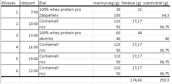 215g Fehérje 88.6g Szénhidrát és 33.5g zsír , 1600 Kcal + csipet só vegeta -