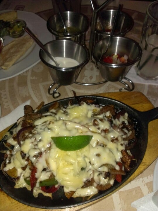 "Pácolt és grillen megsült falatkák, izzó vastányéron tálalva, kaliforniai paprikával és hagymával. Kukorica tortillával, mexikói rizzsel, sült babpürével, és avokádókrémmel körítve."