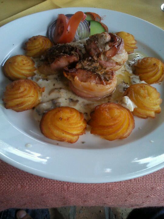 Bacönbe tekert hús,tejszínes,gombás öntet szarvasgomba reszelékkel,hercegnőburgonya