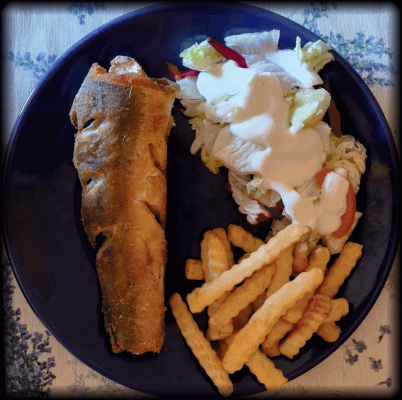Rántott harcsa,saláta,hasáb -