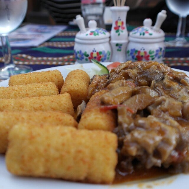 Krumplipüré fasírttal, erőspaprika savanyúsággal.