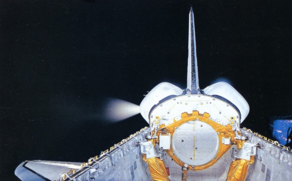 A Discovery, látható a három SSME, a két piros védősapkával védett OMS hajtómű, és az aranyfóliával lefedett kis kerek RCS hajtóművek