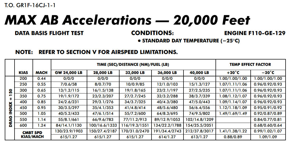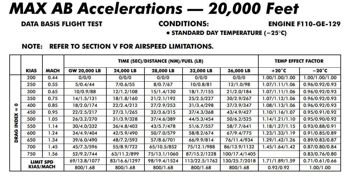 Gyorsulások, 28 000 font tömeg, M0,75 --> M1,24, ez a harcászatilag reális tartomány és ahol az F-35A még szupercirkálni is képes 8-10 km-en. DI = 0, és DI = 150-nél 20 ezer lábon, ez a MANPAD zónán kint és a SHORAD zóna határa van azon is kívül, a harcászati gépek jellemző üzemi tartománya.